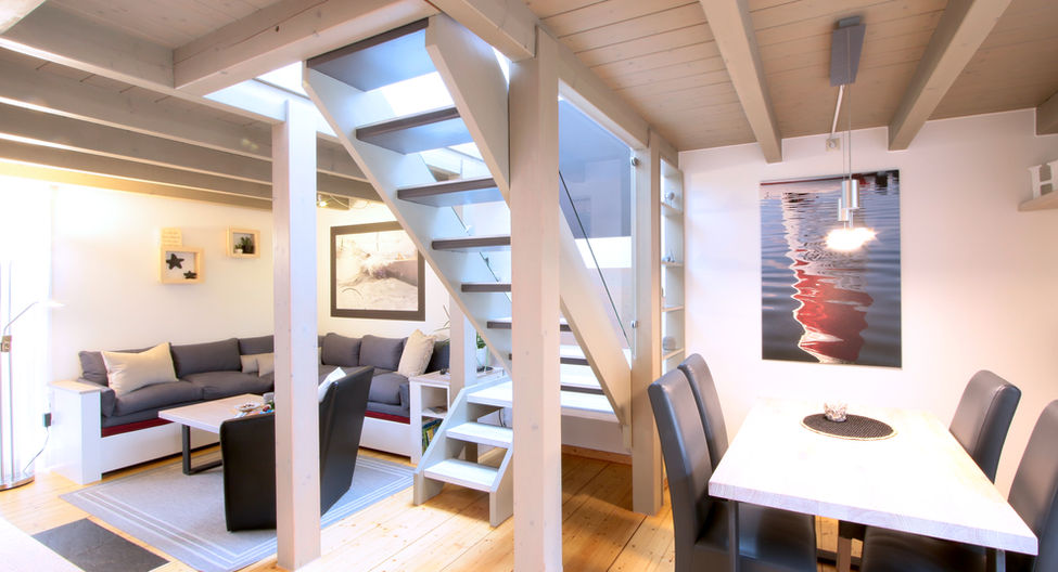 Der besondere Charme unseres Ferienhauses liegt in der sichtbar verarbeiteten Holzkonstruktion, die Wärme und Gemütlichkeit ausstrahlt.